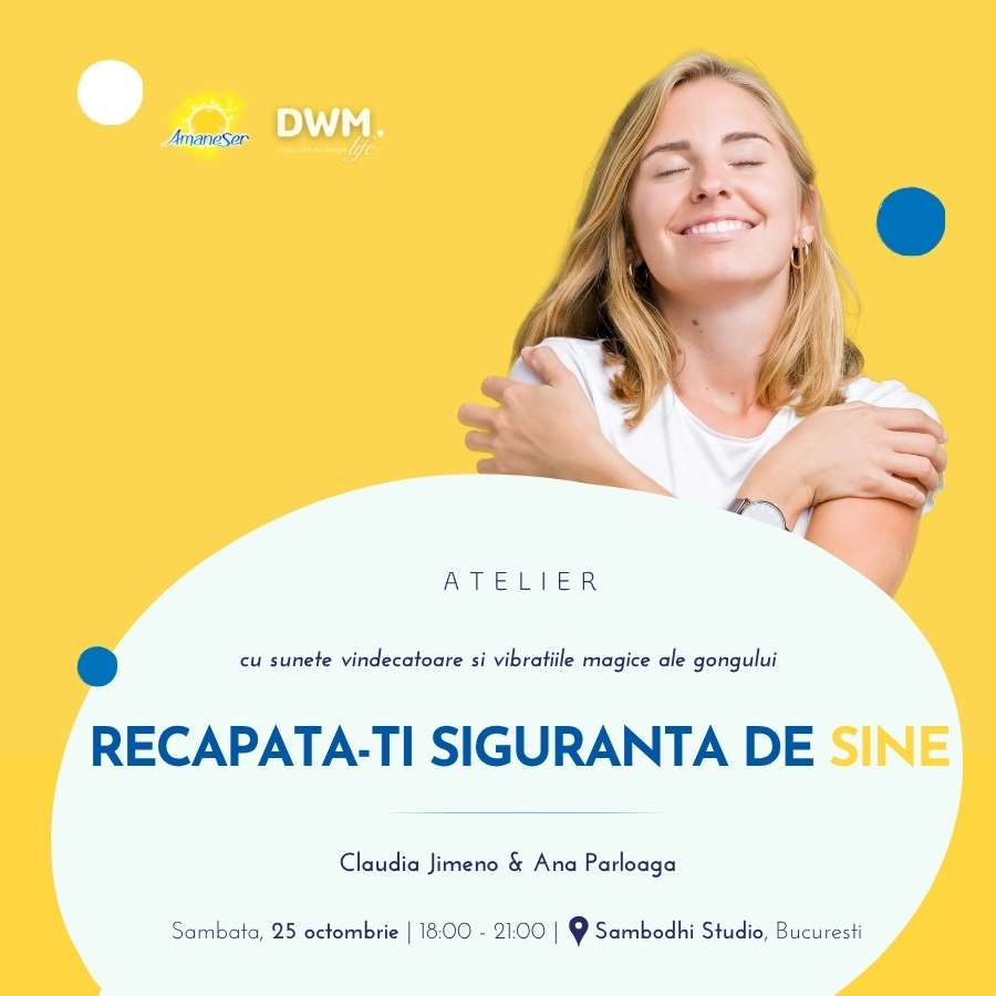 „Recapata-ti siguranta de sine” este un atelier in care vei intra in contact cu sunetele vindecatoare canalizate de Claudia Jimeno si de vibratiile magice ale gongului percutat de Ana Parloaga.