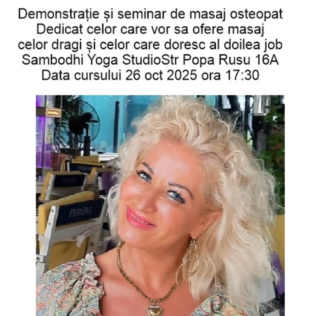 https://sambodhi.ro/organizer/?fesection=organizer&feparam=698Specialist osteopatie-masaj, absolventă a Școlii Germane de Wellness și SPA, cu o experiență de 25 ani de lucru în Germania, pe vase internaționale de croazieră şi în România, Mariana este acea persoană care transmite magic mișcările necesare corpului tău, spre a-l aduce într-o stare de armonie și funcționare naturală. Din dorința de cunoaștere și de extindere a orizonturilor, Mariana a urmat specializări și cursuri în osteopatie, terapie craniosacrală, Namikoshi Shiatsu, masaj abdominal Chi Nei Tsang, masaj ayurvedic abiangham, drenaj limfatic Vodder, masaj thailandez, lifting facial, masajul scalpului, yumeiho. De asemenea, a studiat acupunctura la Academia David Simons din Elveția. Pentru că este un profesionist excepțional care ține la starea de bine a omului cu care lucrează, Mariana execută toată gama de masaje, pentru a se putea adapta perfect la nevoile celor cu care lucrează. În urma ședințelor de masaj și posturologie pe care le oferă, clienții Marianei au avut rezultate notabile pe toate ariile de acțiune, precum scăderea în greutate, regenerarea părului sau face rejuvenation. Iar pentru a înțelege gradul de măiestrie și dedicare al Marianei atunci când se mulează pe nevoile clienților săi, trebuie să știți că asociază masajului și acupunctura. Iar pentru persoanele care au fobie de ace folosește moxibustia și auriculoterapia.