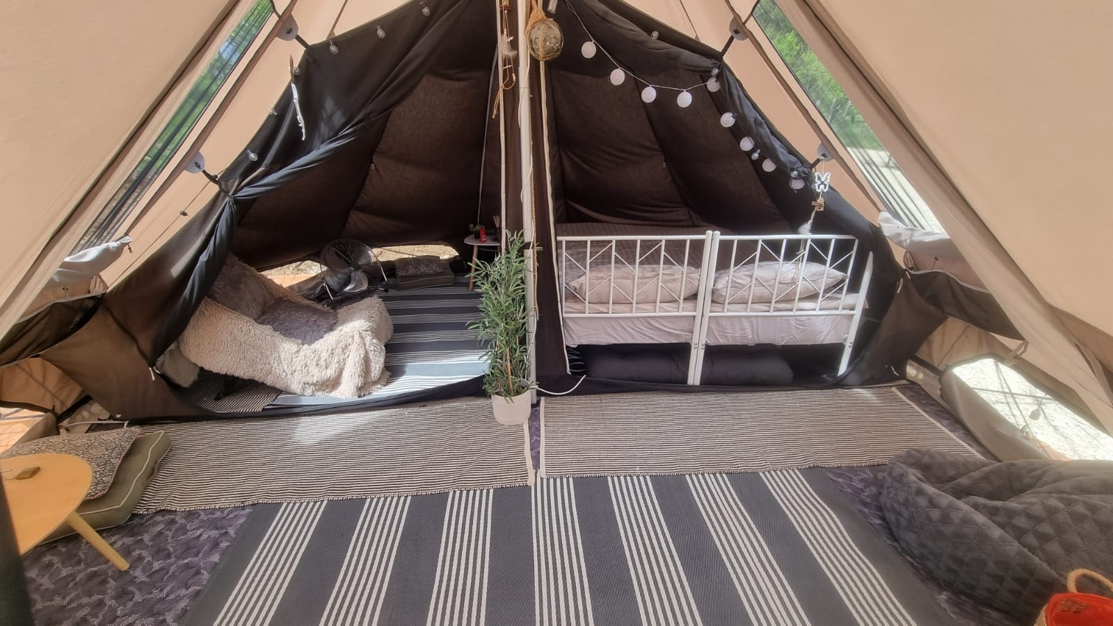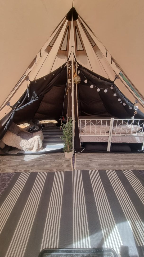 📌 Prețul pentru cazare – 150 lei de persoană pe noapte – vei fi cazat cu altă persoană în cort (300 lei pe cort pentru cuplu), în cort cu paturi separate şi cu posibilitatea de a izola cu o copertină pentru intimitate, aer condiționat, toaletă+duş pentru fiecare cort. Dacă preferi cort singur – 200 lei pe noapte.