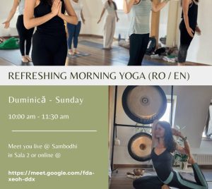 Hei 🙂 eu sunt Alina si calatoria mea prin yoga a inceput intr-o zi senina, in parc. Atunci m-am indragostit de sentimentul de conexiune pe care il putem simti atunci cand miscarea ne face mai prezenti, mai constienti de lucrurile frumoase care ne inconjoara. De atunci, dupa variate intersectari si explorari si in alte sporturi si terapii, mi-a ramas acea tanjire dupa intregire (de altfel, "yoga" inseamna "uniune"). Cel mai pregnant am simtit-o intr-o calatorie sabatica prin America de Sud, unde yoga m-a ajutat sa ma centrez si sa ma regasesc intr-o lume noua si indepartata. In prezent te invit la un inceput de zi cu timp pentru tine. La o joaca de-a ne redescoperi prin secvente de miscari si a ne asculta in momentele de relaxare. De ce dimineata? Pentru ca natura si lumea inca se dezmeticeste si energia e mai blanda. Yoga la inceputul zilei ne ofera o stare de spirit mai buna si un tonus care ne sustine in activitatile de peste zi. E momentul in care ne putem elibera de tensiunile din corp prin miscare si exercitii de respiratie, momentul in care ne putem seta intentii si practica recunostinta. Te astept cu drag! Sa fie cu toate cele bune!